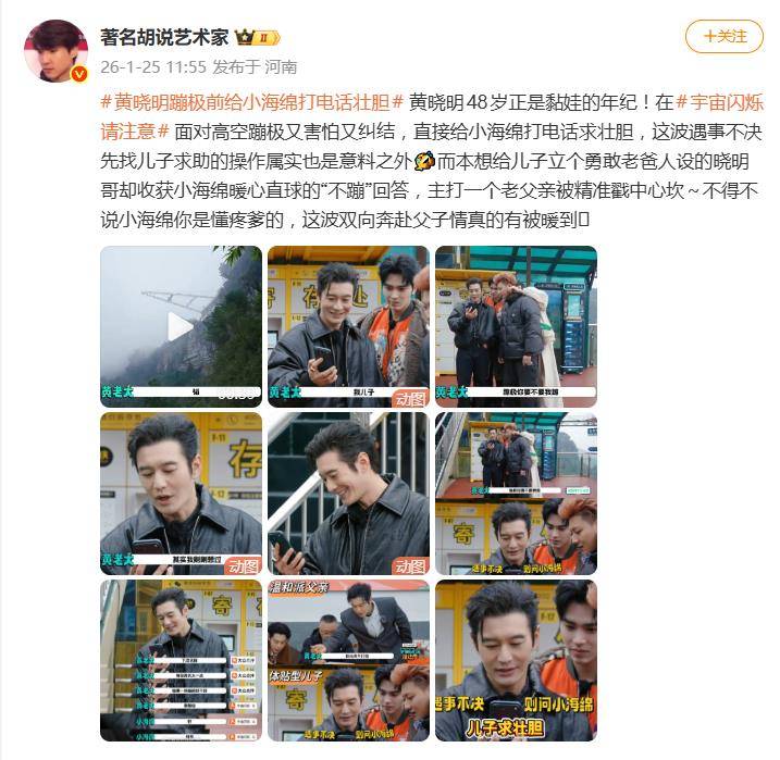 据网友1月25日爆料,48岁的黄晓明站在蹦极台前腿软犹豫,第一反应不是深呼吸,而是掏出手机打给儿子——这幕发生在综艺《宇宙闪烁请注意》中的场景,瞬间让“硬汉老爸的软肋”冲上话题榜。本想从8岁儿子小海绵那儿讨一句“爸爸加油”壮胆,没想到收获的是孩子一句直球式的关心:“爸爸你别蹦了!”本想立威,反被“劝退”,老父亲当场被暖到眼眶泛红。